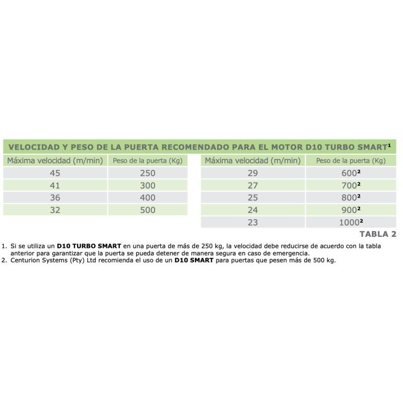 Motor D10 TURBO SMART, 1000 KG, alta velocidad, capacidad hasta 45 mts por minuto (velocidad ajustable de acuerdo al peso de la estructura) , capacidad 750 ciclos diarios, receptor incorporado, con capacidad hasta 1500 controles Centurion. Incluye motor, central (configurable a través de aplicación celular), 2 baterias 12V/7Ah, motor utiliza magnético de origen incluido en el motor. *controles remoto se venden por separado.